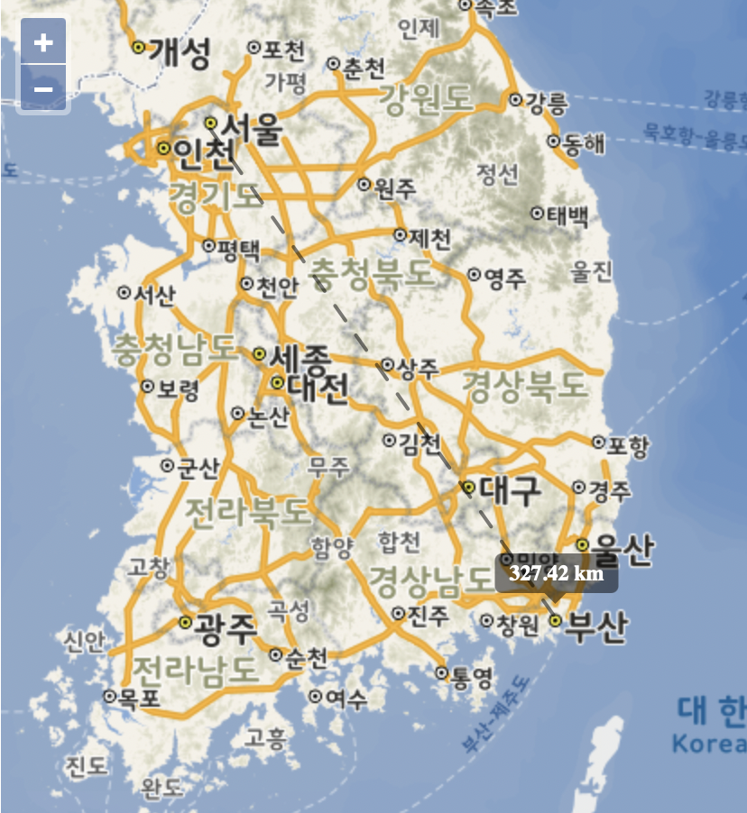 소스를 컴파일 하고 서울에서 부산까지 직선거리를 측정해보았다.